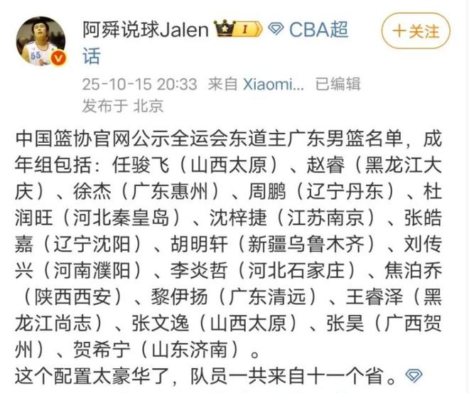 对于广东队的这套阵容,其他地方的球迷都非常眼红,不过也有一些不同的声音。辽宁籍体育博主“阿舜说球”就发声对广东全运会阵容进行了嘲讽,表示“队员一共来自十一个省”。正常情况下,全运会阵容都会以本省球员为主,不过花钱请人打球也并不罕见,比如今年的四川队,就请了周琦、胡金秋、孙铭徽、赵岩昊等球员代表四川队出战本届全运会。而广东队的阵容虽然非常豪华,但至少都是来自广东三支球队,或者曾经在这三支球队中征战过的球员,这些球员的关系都在广东体育局,代表广东队出战全运会也无可厚非。