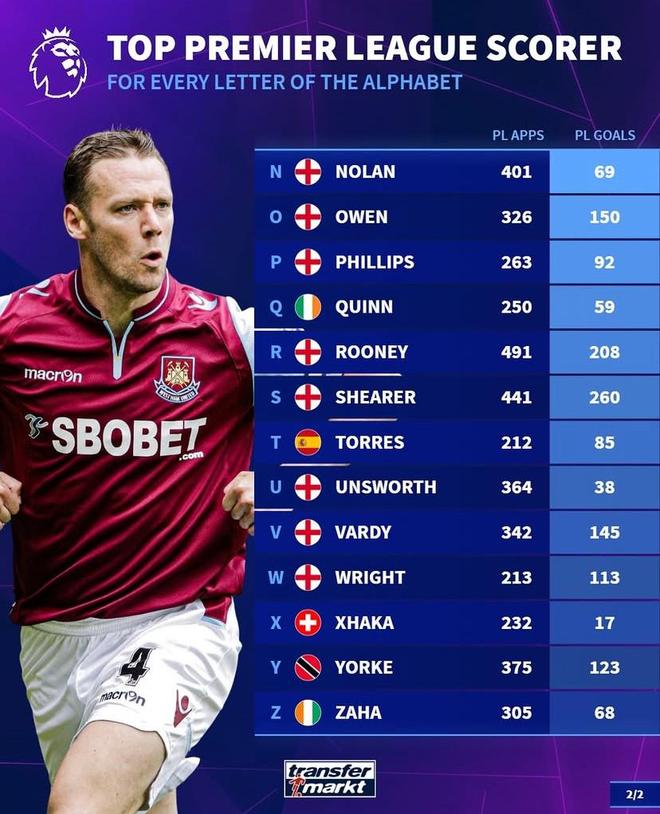 德转按球员姓氏首字母列英超历史最佳射手: